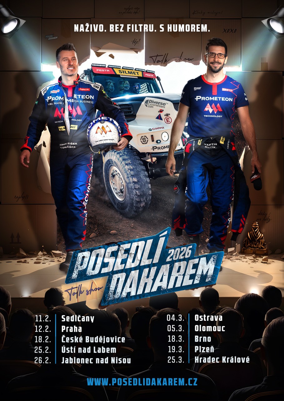 Večer přináší čerstvé historky z Dakar Rally – tak, jak je zažijete jenom s několikanásobnými vítězi. Martin Macík a František Tomášek vyprávějí s humorem, nadhledem a upřímností sobě vlastní, co se děje v kabině, v bivaku i mezi etapami. Těšit se můžete i na exkluzivní 45 minut dlouhý dokument z Dakaru 2026. Prožijete večer, který dýchá pískem, prachem.